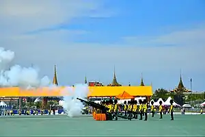 A special elephant parade in honor of the recent coronation was held within the streets surrounding the Grand Palace organized by the Ayutthaya Elephant Palace and Royal Kraal Foundation, evoking memories of the Ayutthaya and Thonburi periods wherein the royal family and nobility rode elephants in the dirt roads of the old city. 11 elephants accompanied by their handlers marched on across Sanam Chai Road from the Territorial Defence Command Building to Wat Phra Kaew and vice versa.[18] The Rice Department released five new rice varieties/cultivars in honour of the coronation, all numbered "...62" for BE2562.[19] This is a continuation of the tradition of his ancestor, Chulalongkorn (Rama V), who founded the royal rice varieties competition.[20][21]