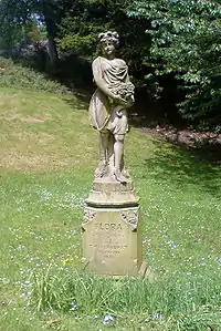 The statue of Flora, the Roman Goddess of flowers and spring was presented in 1871 by T. H. Fairhurst. The statue was the work of Thomas Allen of Liverpool who moved to the town in 1870 and created a number of other works in the area, including honeycombed facing stones on the Old Bank in Higher Church Street and the carving on the side of the old YMCA building near Sudell Cross (now the Sir Charles Napier public house).[1][7] In 1880 the first park bandstand was constructed west of the large lake. This was supplemented two years later with Italian gardens laid out adjacent to the Broad Walk.[9] The statue of Flora inspired horror writer William Hope Hodgson to write his first fiction story "The Goddess of Death".