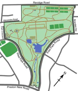 The 18 hectare (44.5 acre) park[1] occupies a relatively central location to the west of the main town centre precincts. The land is delineated to the north and south by two of Blackburn's main arterial roads. Revidge Road stretches for 490 metres (535 yards) along its northernmost edge; the grand southern entrance at Preston New Road (90 metres, 98 yards) arches away immediately along East and West Park Roads to reach its greatest width of 625 metres (685 yards) from Park Crescent to Brantfell Road.[6] The grounds can be entered from the main southern entrance, two entrances aside the east and west porter's lodges or ten other gates on the perimeter of the park.[1]