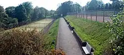 A Grade II listed triumphal archway with flanking lodges (see picture above) marks the main entrance at the southern edge of the park, from which the landscape widens and rises 84 metres (276 ft) to its peak adjoining Revidge Road in the north.[2] Over one of the smaller side arches reads an inscription: "This park was publicly opened on the 22nd day of October 1857 during the mayorality of WILLIAM PILKINGTON ESQUIRE, by whose munificence the four ornamental fountains were presented to the borough".[7] Travelling through the large archway for carriages or two smaller side arches on foot, visitors are presented with the largest of these recently restored ornamental fountains to the right and a war memorial and formal garden of remembrance (laid out in 1922) on the left. The fountain was formerly powered by gravity, with a water jet rising 23 metres (75 ft) into the air, although the modern jet is more modest.[2] A former reservoir providing drinking water to Blackburn lives on as one of two lakes in the park. The areas of water are home to a number of species of waterfowl, including mute swan, moorhen and ducks.[2] A stream, Snig Brook, flows down the park from the ponds to the memorial garden, broken by waterfalls and pools.[2]