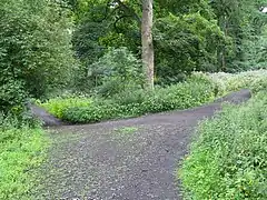 The LNR consists of three broad types of woodland. There are about 15 acres (6.1 ha) of oak and birch woods into which sycamore and beech have been introduced. Some 21 acres (8.5 ha) of mixed broadleaf woodland are present, composed primarily of native ash, oak and elm into which sycamore, lime, Norway maple, horse chestnut, sweet chestnut, beech and various conifers have been introduced. And there are about 11 acres (4.5 ha) of more formal policy woodland originally associated with Hillwood House and Calderwood House, and composed of a variety of native and non-native broadleaf and coniferous species.[7]