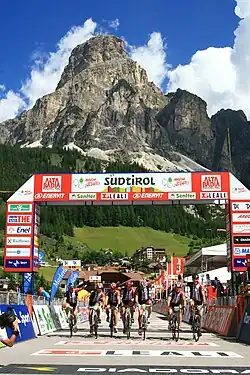 The finish of the annual single-day seven mountain passes crossing Maratona dles Dolomites bicycle race is in Corvara.