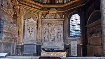The marble and bronze sepulchral monument of Cardinal Pietro Foscari was originally placed in the middle of the Foscari Chapel, which was demolished for the building of the Cerasi Chapel in 1600. It was made by a Sienese sculptor, Giovanni di Stefano in the 1480s but previously thought to have been created by Vecchietta.
