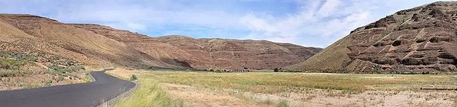 Park headquarters, about a two-hour drive east of Portland, is adjacent to Oregon Route 206 between Wasco and Condon.[1] The river, which here forms the boundary between Sherman County on the west and Gilliam County on the east, meanders for 16 miles (26 km) through the arid park.[2]
