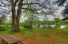 Council Grounds State Park is a 509-acre (206 ha) Wisconsin state park on the Wisconsin River. It was originally a Merrill city park that was donated to the state in 1938, evolving in designation from a state roadside park to a state forest to full state park status in 1978. The Works Progress Administration planted trees and built visitor amenities. The name Council Grounds comes from reports that the site was once used for seasonal gatherings of Native Americans.