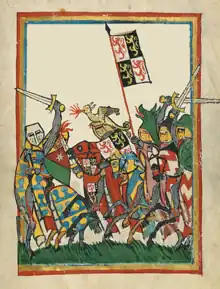 The family came into a difficult position when Diederick's nephew, Duke Walram V of Limburg, died in 1280. The Limburg Succession War (1283–1288) around the Duchy of Limburg erupted in fury. At Battle of Woeringen Saturday 5 June 1288, just north of Cologne on the river Rhine, the Duke of Brabant and his allies defeated Van Mark, Gulik-Loos, Bergse sergeants and Cologne civilians in a devastating battle of the Cologne Archbishop Siegfried van Westerburg with allies, Gelre, Valkenburg and Kur-keulen sergeants. Diederick of Limburg with son Everhard did not personally participate, but did support the Cologne archbishop. As a result, great-nephew Count Everhard of the Mark, who had sided with Duke Johan I of Brabant and was one of the victors, destroyed the Neuen Isenberg and took and occupied the Hohenlimburg.[20] Diederik I, Everhard I and other family members fled to their alloidal castle Styrum (near present-day Oberhausen), where Diederik died in 1301.