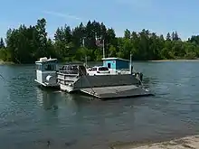 The river arrives at Spongs Landing County Park, then Spongs Bar and Lincoln Bar before passing Windsor Island and receiving Spring Valley Creek from the left at about RM 75 (RK 121). Slightly further downstream, the Willamette becomes the boundary between Marion County on the right and Yamhill County on the left and receives King Creek from the left. Here Willamette Mission State Park is on the right. Flowing by Beaver Island, on the right, the river reaches the Wheatland Ferry, which carries vehicles traveling on Wheatland Road. Beyond the ferry, the river passes the Wheatland, Upper and Lower Martine, Matheny, and Eldridge bars and receives Eldridge Slough from the right at about RM 69 (RK 111). Passing the Snaggy Bend, Allison, Fairfield, and Duke bars, the river reaches Lambert Bar and receives Lambert Slough from the left. The river flows around Five Islands, the Five Islands Bar and the Coffee, Weston, Candiani, and Mission bars before receiving the Yamhill River from the left 55 miles (89 km) from the mouth. About 2 miles (3 km) below the Yamhill, Chehalem Creek enters from the left, and then the river flows around Ash Island, where it receives High Water Slough from the right. Downstream of the island, the city of Newberg is on the left, 50 miles (80 km) from the mouth.[6][9][16]