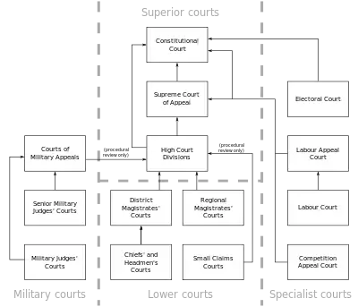 Specialist courts have been established for various matters, including Labour Courts, the Land Claims Court, Special Income Tax Courts, and the Electoral Court. African customary law is administered by chiefs' and headmen's courts, subject to the National House of Traditional Leaders.