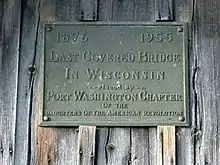 The bridge displays a plaque, placed on it in 1955 by the Port Washington Chapter of the Daughters of the American Revolution, that identifies it as the "last covered bridge in Wisconsin" and lists the dates of 1876 and 1955.[4] In 1965 a historical marker was erected in front of the bridge by the Ozaukee County Historical Society which identifies it as "Last Covered Bridge" and states that it was built in 1876 and "retired" in 1962.[6]