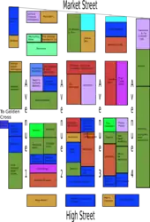 The Covered Market was officially opened on 1 November 1774 and remains in use.[1] It was established in response to a general wish to clear 'untidy, messy and unsavoury stalls' from the main streets of central Oxford.