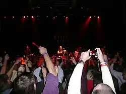 Cowboy Mouth performing "Everybody Loves Jill" on Mardi Gras night in Houston, 2010, with fans waving red spoons in anticipation of their cue to throw them at the band.