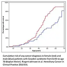 | Cumulative risk for the development of cancer in males and females with Cowden syndrome from birth to age 70. | |
