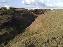 This chine's vegetation is a mixture of hardy bushes, scrub and rough grasses. At the widest part of the chine erosion and layers of grey sediment are visible.