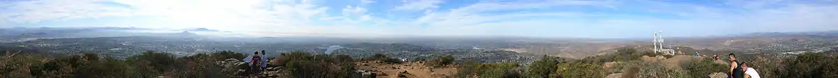 The main trail to the summit is a popular hiking destination taking hundreds of people per day to a 360-degree panorama of San Diego County. The hike to the top is 1.5 miles (2.4 km) long and an elevation change of about 950 feet (290 m). This trail is on the corner of Golfcrest Drive and Navajo Road. A much-less-used but maintained trail begins near the intersection of Boulder Lake Avenue and Barker way. This trail meets the main trail near the summit.