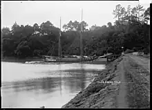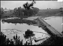 Industrial development in the area started with a brick factory in 1860 with products being shipped via Coxs Creek to Auckland. In 1899, Cashmore Brothers set up a steam-powered sawmill beside the creek below Coxs Bridge Rd (later renamed West End Rd).[8] The bay and creek were used for the transport of logs and timber. Despite strong protest by the growing local population, this mill operated until 1920 when it accidentally burnt down leaving sawdust and timber smouldering for over a year.[8][9]