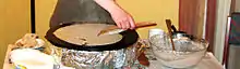The batter is spread out onto a disc with a small spatula called a rozell (Breton), rouable or raclette in the local French dialect. Crêpes based on the Breton recipes are usually made with a simple crêpière (or frying pan).