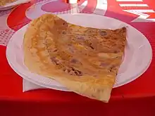 The Crêpe bretonne (krampouezenn in the Breton language) is a traditional dish in Lower Brittany, a region of France. It can be served plain, or filled with sweet or salty ingredients. The Crêpe bretonne can be made of wheat (sweet crêpe) or buckwheat (salted crêpe). This last is less well-known and should not be confused with the buckwheat pancake typical of Upper Brittany, which has a different recipe.