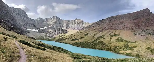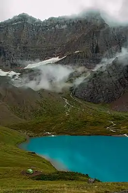 Cracker Lake is located in Glacier National Park, in the U. S. state of Montana. Located at the head of a canyon, the waters of Cracker Lake are an opaque turquoise from rock flour (silt) originating from Siyeh Glacier. To the south of Cracker Lake lies Mount Siyeh which rises more than 4,000 feet (1,200 m) above the lake. Cracker Peak to the southeast and Allen Mountain to the north are other prominent peaks nearby.[2] Cracker Lake is a 6.1-mile (9.8 km) hike from the Many Glacier Hotel.[3]