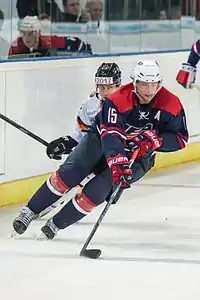 Smith with the United States men's national hockey team in a game against German's men's national hockey team.