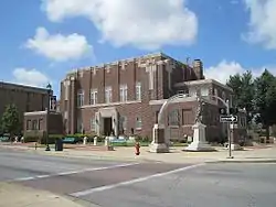 The Craighead County Courthouse is located at 511 Main Street, in the center of Jonesboro, Arkansas, the county seat of Craighead County. It is a two-story brick structure with limestone trim, built in 1934, and is the city's only significant example of Art Deco architecture. The building has a stepped appearance, with a large central block that has an oversized second story, and is flanked by smaller two-story wings, from which single-story sections project to the front and back. Vertical panels of fluted limestone accentuate corner projections from the main block, a motif repeated near the roof line of that block. The main entrance is recessed in an opening flanked by similarly fluted panels. The courthouse is the fifth of the county to stand on the site. Near the entrance to the courthouse stands a copy of John Paulding's World War I memorial, Over the Top, placed in 1920, and often confused with E. M. Viquesney's "Spirit of the American Doughboy".[3][4]