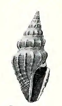 (Original description) The solid, acute shell is biconic. Its color is olive brown with a purplish aperture. The protoconch contains two whorls, the first minute, smooth, rounded, the second with a peripheral keel. These are followed by eight sculptured whorls. The suture is appressed, obscure, behind a strongly constricted anal fasciole sculptured with almost microscopic spiral striae. The other spiral sculpture consists of small obsolete threads covering the whole surface in front of the fasciole and three or four cords on the base of the body whorl widely separated and conspicuously nodulous where they cross the ribs. There are also 10 or more closer cords on the siphonal canal. The axial sculpture consists of (on the spire about a dozen) short narrow ribs, very prominent and almost angular in front of the fasciole and on the body whorl extending nearly to the siphonal canal, with wider interspaces and not nodulous behind the base. The incremental lines are very fine and minutely crenulate the fine spiral sculpture in places. The aperture is narrow. The short anal sulcus is rounded, with a strong subsutural callus. The outer lip is thin, smooth inside, moderately arcuate, with a hump-like varix behind it. The inner lip and the straight columella are covered with a thin layer of enamel, raised anteriorly at the edge. The short siphonal canal is not deep and is hardly differentiated from the aperture.[2]