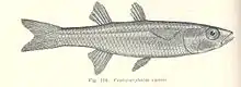 Craterocephalus eyresii is a small drab yellowish-grey coloured fish with greenish-silvery underside, and a silver mid-lateral stripe which has some dark melanophores around it., and transparent to yellowish fins. There are two dorsal fins which are widely separated with the first dorsal fin originating before the tips of the ventral fins and the anal fin origin lies directly underneath the origin of second dorsal fin. The caudal fin is forked. The fins are yellowish in colour.[2] It attains a maximum total length of 10 centimetres (3.9 in).[1]