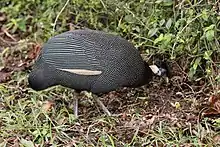 The crested guineafowl (Guttera sp.) are a group of three species and members of the Numididae, the guineafowl bird family. They are found in open forest, woodland and forest-savanna mosaics in sub-Saharan Africa.