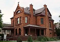 The two-and-a-half-story mansion covers 4,200 square feet (390 square meters),[2] and immediately behind the mansion exists an accompanying 1,500-square-foot (140-square-meter) carriage house.[3] The exterior, constructed of red sandstone, combines elements of the Richardsonian Romanesque and Queen Anne styles. At the time it was built, the mansion enjoyed a view of the Front Range of the Rocky Mountains. Today, however, the view is obstructed by modern buildings.[4]