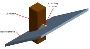 A cricket or saddle is a ridge structure designed to divert water on a roof around the high side of a large penetration, typically a skylight, equipment curb, or chimney.[1] In some cases, a cricket can be used to transition from one roof area to another. On low-slope and flat roofs with parapet walls, crickets are commonly used to divert water to the drainage, against or perpendicular to the main roof slope.