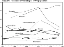The manner in which the United States' crime rate compares to other countries of similar wealth and development depends on the nature of the crime used in the comparison.[46] Overall crime statistic comparisons are difficult to conduct, as the definition and categorization of crimes varies across countries. Thus an agency in a foreign country may include crimes in its annual reports which the U.S. omits, and vice versa.