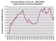 In the long term, violent crime in the United States has been in decline since colonial times. The homicide rate has been estimated to be over 30 per 100,000 people in 1700, dropping to under 20 by 1800, and to under 10 by 1900.[9]