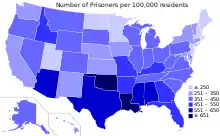 The United States has the highest incarceration rate in the world (which includes pre-trial detainees and sentenced prisoners).[44] As of 2009, 2.3 million people were incarcerated in the United States, including federal and state prisons and local jails, creating an incarceration rate of 793 persons per 100,000 of national population.[44] During 2011, 1.6 million people were incarcerated under the jurisdiction of federal and state authorities.[45] At the end of 2011, 492 persons per 100,000 U.S. residents were incarcerated in federal and state prisons.[45] Of the 1.6 million state and federal prisoners, nearly 1.4 million people were under state jurisdiction, while 215,000 were under federal jurisdiction.[45] Demographically, nearly 1.5 million prisoners were male, and 115,000 were female, while 581,000 prisoners were black, 516,000 were white, and 350,000 were Hispanic.[45]