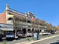 The hotel is a two-storeyed brick building, with a principal western facade addressing Palmerin Street, the main street of Warwick. The long street frontage features a two-storeyed filigree verandah running its full length with a masonry parapet above, whose central bay announces the hotel's name, and 1917 as its date of construction. Behind the parapet is a meandering mostly-hipped corrugated iron roof, over the main wing and the three perpendicular accommodation wings running east. At ground level, the street frontage has a series of decorated entries to the different areas of the hotel and an adjoining tenancy.[1]
