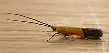 The wingspan is about 10 mm (0.39 in).[1] The forewings are orange-yellow with a small blackish spot on the costa at one-third from the base and a broad, purplish-fuscous, hindmarginal band, occupying one-third of the wing, the anterior edge darker, and slightly curved outwards. There is a yellowish, elongate spot on the costal portion of the band. The hindwings are dark-fuscous.[2]