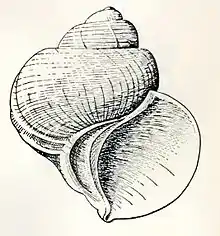 Sculpture:The body whorl shows fine, close spiral threads of which every fourth is larger. At irregular intervals incipient varices traverse the whorl. On the penultimate whorl the spiral sculpture is more coarse and distant. The umbilicus is narrow, bordered by a slight rib, which, continuing to the anterior extremity, is there notched by the pseudocanal. The aperture is oval. The thin outer lip is everted.
