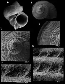 Sculpture : the upper whorls carry three thick, elevated, spiral ribs, divided by broad, deep grooves. These vanish on the body whorl, which is entirely covered by dense, microscopic spirals so crossed by radials as to give the effect of fine punctures over the whole surface. The basal funicle is massive, coiled on the body whorl like a subsidiary whorl, far extended anteriorly, its truncate extremity excavate. A small perforation occurs below the subcircular aperture in the base of the funicle. The simple outer lip simple is inner reflected over the umbilicus. The umbilicus has superiorly a narrow spiral perforation, inferiorly a trough hollowed between the columella and the funicle.[2]