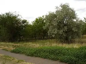 A stand of trees with a Russian olive prominent in the right foreground.