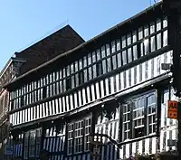 The Crown Hotel is a black-and-white, timber-framed and plaster three-storey building with a tiled roof.[1] The street-facing front, described by Nikolaus Pevsner as "impressive", is flat and features close studding with a middle rail.[6][18] Unlike many buildings of a similar date in the town, it lacks ornamental panelling.[18] Each storey has small overhangs, with carved corbels (brackets).[1] All three storeys have restored mullioned and transomed windows in oak.[1] The second (top) floor features unusual continuous windows along the entire front.[1][6][19]