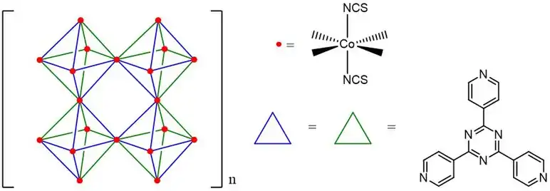 The first crystalline sponges developed by Makoto Fujita is [(Co(NCS)2)3(TPT)4], which is an infinitely extensive framework of Co2+ octahedral complex. Each octahedral complex is composed of six Co(NCS) vertexes and four 2,4,6-tris(4-pyridyl)-1,3,5-triazine (TPT) ligands. Besides the basic octahedral cavity (M6L4), there are also two different cuboctahedral cavities (M12L8 and M12L24) which can accommodate larger molecules, such as C60, C70.[3]