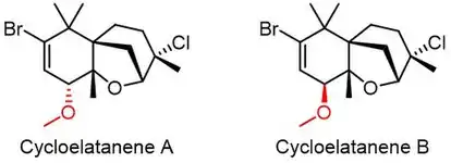 Cycloelatanene A and B are a pair of diastereomers isolated from Laurencia elata.[12] Both compounds are liquid, so the traditional X-ray diffraction analysis cannot elucidate their absolute chirality. After the crystalline sponges assisted X-ray crystallography, the Fujita group revised the chirality of C4 position reported by precedent NMR analysis.[12][13][14]