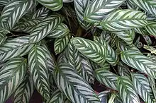 Ctenanthe oppenheimiana, the giant bamburanta or never-never plant, is a species of flowering plant of family Marantaceae and is a native of Brazil.[1] It is an evergreen perennial. This plant can grow to more than 1 m (3.3 ft) tall and broad, with long narrow leaves up to 40 cm (16 in) in length. The leaves are adorned on the secondary veins with dark green bands, which meet and merge in the margins. In between are cream coloured bands. The undersides of the leaves have a red-ish colour.[2][3][4] The cultivar ‘Tricolor’ is a common ornamental variety, which as a houseplant in the UK has gained the Royal Horticultural Society’s Award of Garden Merit.[5] (confirmed 2017).[6] This cultivar is visually very similar to Stromanthe Sanguinea 'Triostar', and the two are often confused. The difference between the two lies in the lack of regular banding on the leaves of the Sromanthe, and the generally more rounded shape of the leaves in Ctenanthe.[7]