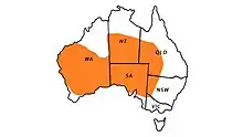 This species is found in central western New South Wales and Queensland, to South Australia and the southern half of the Northern Territory through to the southern half of Western Australia.[4]