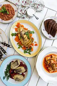 Among cold appetizers, vorschmack is especially popular, as well as a dip made from grilled aubergines.