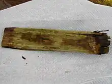Apigi is a Chamorro dish in which roasted coconut is wrapped in banana leaf.[9] A traditional ingredient of Chamorro food is a variety of spice-hot chili pepper called the donne sali.[9] This pepper, thought to have been introduced by the Spanish in the 1600s (Chili pepper is native to the Americas), grows wild on Guam and the Northern Marianas. It is a type of Capsicum frutescens and is very popular part of the culinary aspects and food culture of the islands.[10](see also List of Capsicum cultivars) It is also commonly eaten by birds which have spread it around the islands, and is also called a Boonie pepper.[11] The sauce made from this pepper is called Fina'denne', and is a staple condiment of Chamorro dishes. Translated, it simply means "made from donne' ", the Chamorro word for chili pepper.[12] The sauce finadenne can be made with soy sauce and vinegar (dark finadenne) or with lemon juice and vinegar (white finadenne).[13] The white finadnne sauce is used in making Chamorro cured beef called Tinala' Katne.[13]