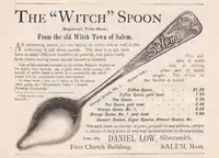 • Daniel Low, a jeweler in Salem, Massachusetts, began selling souvenir sterling "Witch" spoons in 1890, using two different patterns, the first with three pins, the word "Salem", and a witch on a broom. (See right)