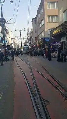 The tram line, which was built in 2011 to continue the transportation on the street; then it was extended to Davutkadı Neighborhood. The 2.4 km long tram line has 5 stops.[7][8][9] The catenary poles built for the energy supply of the tram are also used for lighting purposes.[1] Since catenary poles are also made suitable for painting and photography exhibitions; The street can function as an art gallery in a way.[1]