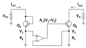 - ↑ An idealized version of the argument in the text, valid for infinite op amp gain, is as follows. If the op amp is replaced by a nullor, voltage V2 = V1, so the currents in the leg resistors are held at the same value. That means the emitter currents of the transistors are the same. If the VCB of Q2 increases, so does the output transistor β because of the Early effect: β = β0(1 + VCB / VA). Consequently the base current to Q2 given by IB = IE / (β + 1) decreases and the output current Iout = IE / (1 + 1 / β) increases slightly because β increases slightly. Doing the math,