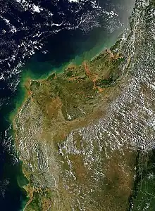 Much of Morondava on the west coast was flooded, after a dam near the city collapsed.[2] Maintirano along the west coast was also damaged, as was Soavinandriana in the island's interior.[4] In the capital city Antananarivo, 90 km/h (56 mph) wind gusts caused power outages and damaged part of the Rova, or the Queen's Palace.[2] In Midongy Atismo in southeastern Madagascar, heavy rainfall flooded 80% of rice crop,[12] and the corn and manioc crops were both similarly affected. These represent the staple foods of the population.[8]