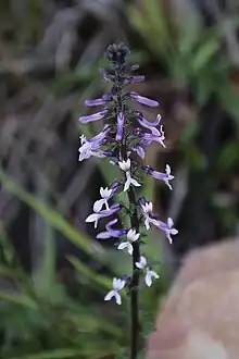 Flowers are present between August and November. They range from white to mauve in colour and are borne in racemes.[4] Each flower is 8–13 mm (0.31–0.51 in) long and is surrounded by a toothed or lobed bract.[4][5] As with other species in the genus, the style has a fluid filled stigmatic cavity rather than free stigma.[5] It has two bearded anthers on the 6 mm (0.24 in) long stamens.[4] The triangular calyx lobes have round interspaces.[5]