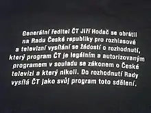 During the Czech TV crisis, ČT reporters organized an industrial dispute by staging a sit-in and occupying the news studio,[2] and rejected attempts by Bobošíková to fire them. They were supported in their protest by politicians such as the then President Václav Havel and by Czech celebrities, but every time they tried to air their news broadcasts, Jana Bobošíková and Jiří Hodač would interrupt the transmission either with a "technical fault" screen reading: "An unauthorized signal has entered this transmitter. Broadcasting will resume in a few minutes," or with their own news broadcasts featuring Jana Bobošíková and a team she had hired to "replace" the staff members she had sought to terminate; news content from Bratislava was also rebroadcast.[3]